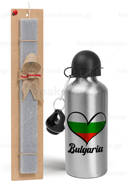 Bulgaria flag, Easter Set, metallic silver aluminum water bottle (500ml) & aromatic flat Easter candle (30cm) (GRAY)