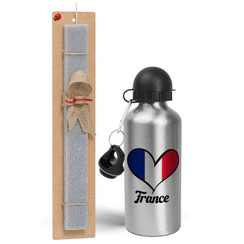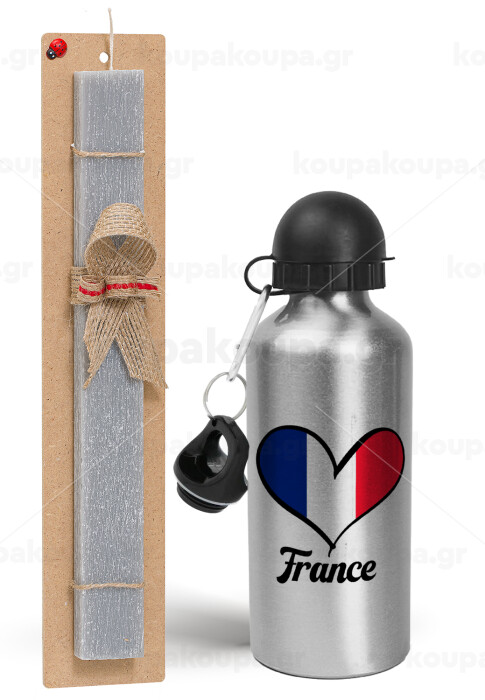 France flag, Easter Set, metallic silver aluminum water bottle (500ml) & aromatic flat Easter candle (30cm) (GRAY)