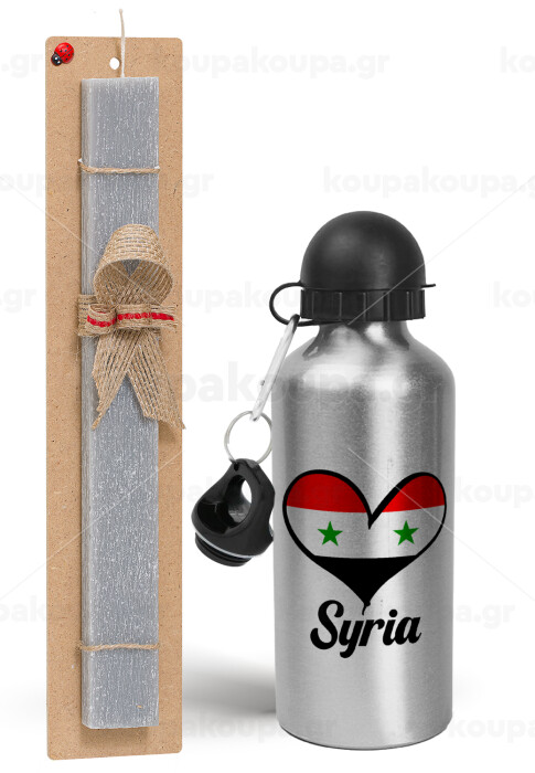 Syria flag, Easter Set, metallic silver aluminum water bottle (500ml) & aromatic flat Easter candle (30cm) (GRAY)