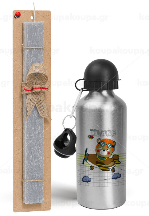 Kids Plane, Easter Set, metallic silver aluminum water bottle (500ml) & aromatic flat Easter candle (30cm) (GRAY)