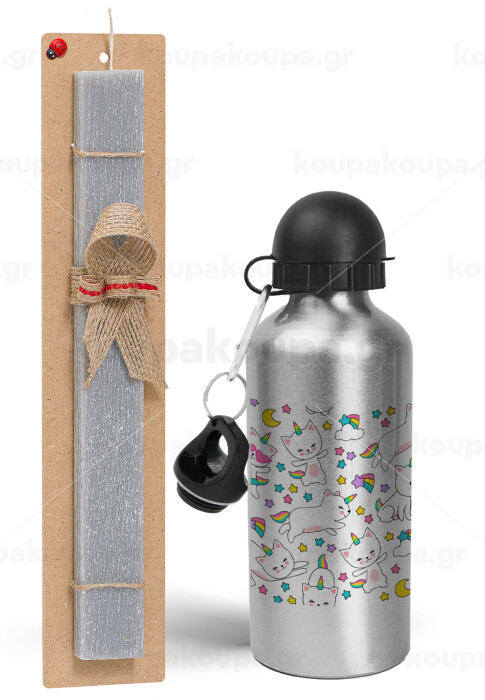 Cats unicorns, Easter Set, metallic silver aluminum water bottle (500ml) & aromatic flat Easter candle (30cm) (GRAY)