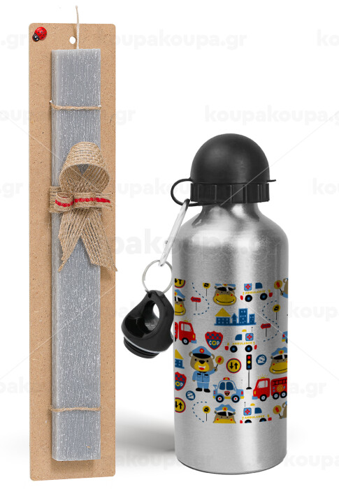 Rescue team cartoon, Easter Set, metallic silver aluminum water bottle (500ml) & aromatic flat Easter candle (30cm) (GRAY)