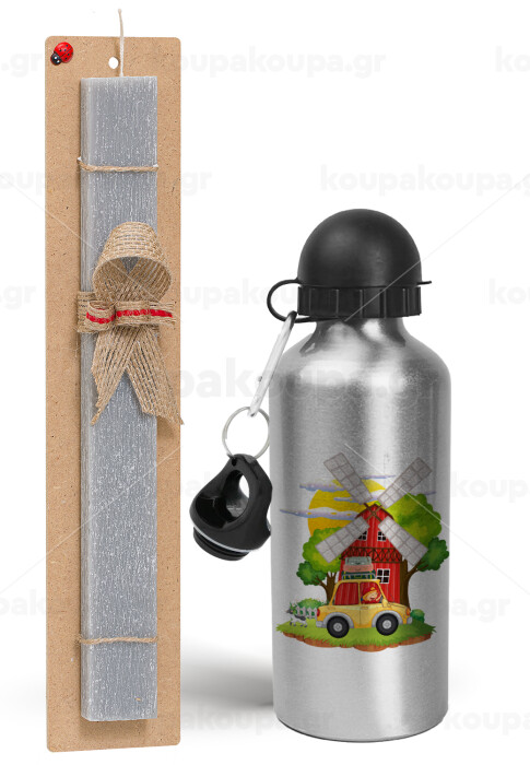 Toy car, Easter Set, metallic silver aluminum water bottle (500ml) & aromatic flat Easter candle (30cm) (GRAY)
