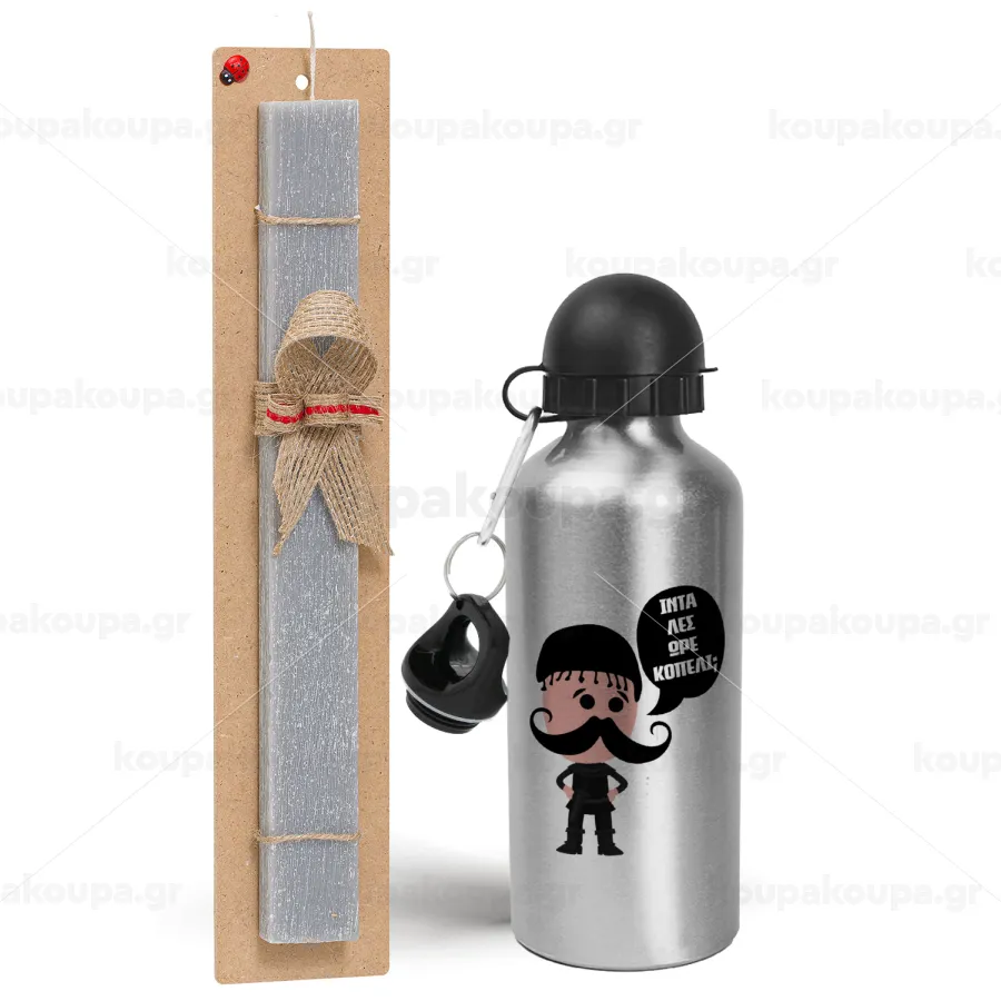 Κρητικός "Ίντα λες ωρέ κοπέλι", Easter Set, metallic silver aluminum water bottle (500ml) & aromatic flat Easter candle (30cm) (GRAY)