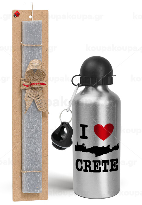 I Love Crete, Easter Set, metallic silver aluminum water bottle (500ml) & aromatic flat Easter candle (30cm) (GRAY)