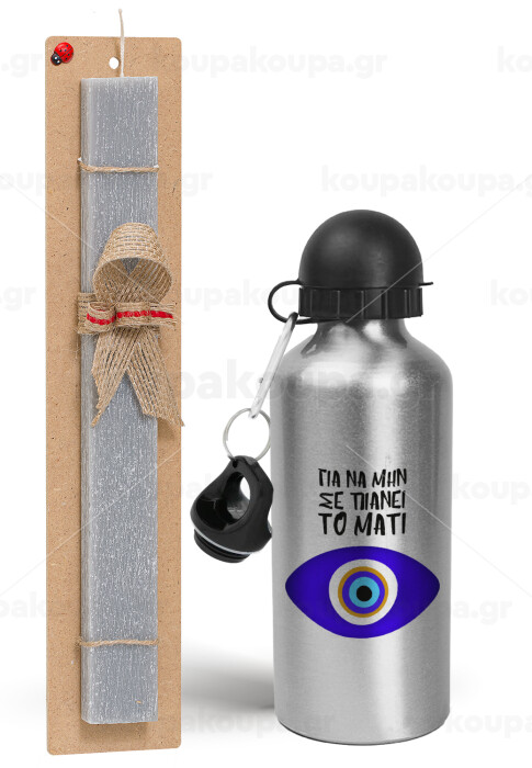 Για να μην σε πιάνει το μάτι, Easter Set, metallic silver aluminum water bottle (500ml) & aromatic flat Easter candle (30cm) (GRAY)