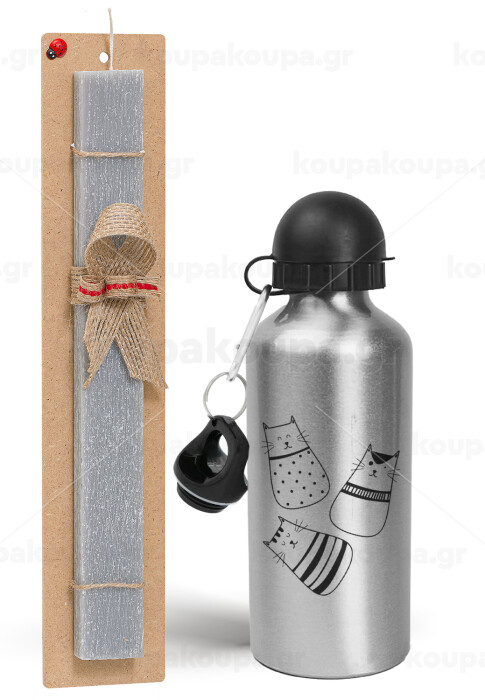 Cute cats, Easter Set, metallic silver aluminum water bottle (500ml) & aromatic flat Easter candle (30cm) (GRAY)