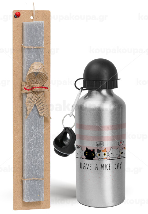 Have a nice day cats, Easter Set, metallic silver aluminum water bottle (500ml) & aromatic flat Easter candle (30cm) (GRAY)