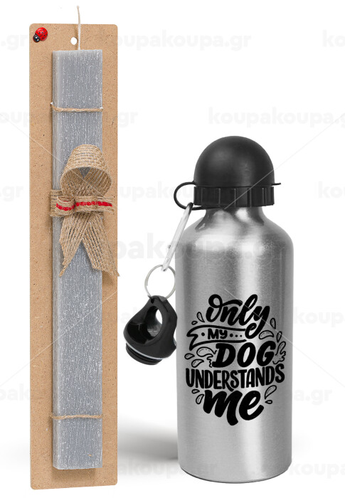 Only my DOG, understands me, Easter Set, metallic silver aluminum water bottle (500ml) & aromatic flat Easter candle (30cm) (GRAY)