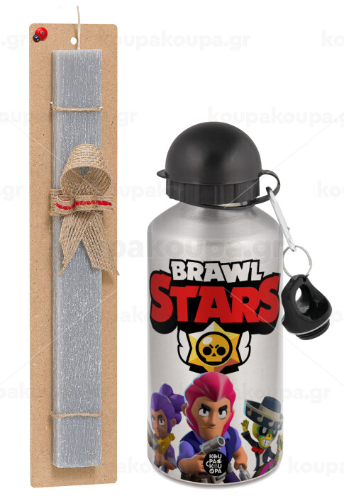 Brawl Stars Blue, Easter Set, metallic silver aluminum water bottle (500ml) & aromatic flat Easter candle (30cm) (GRAY)