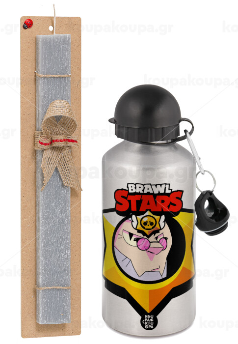 Brawl Stars Byron, Easter Set, metallic silver aluminum water bottle (500ml) & aromatic flat Easter candle (30cm) (GRAY)