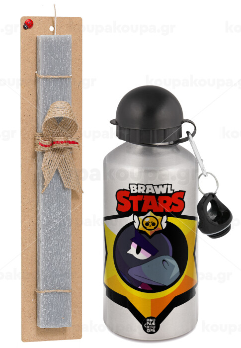 Brawl Stars Crow, Easter Set, metallic silver aluminum water bottle (500ml) & aromatic flat Easter candle (30cm) (GRAY)