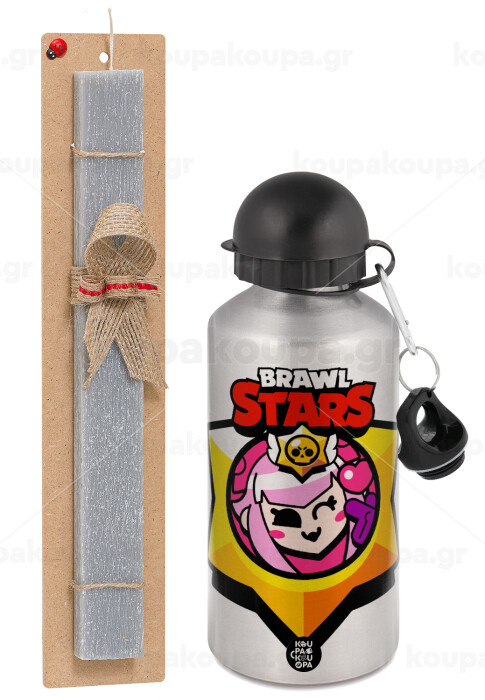 Brawl Stars Melodie, Easter Set, metallic silver aluminum water bottle (500ml) & aromatic flat Easter candle (30cm) (GRAY)