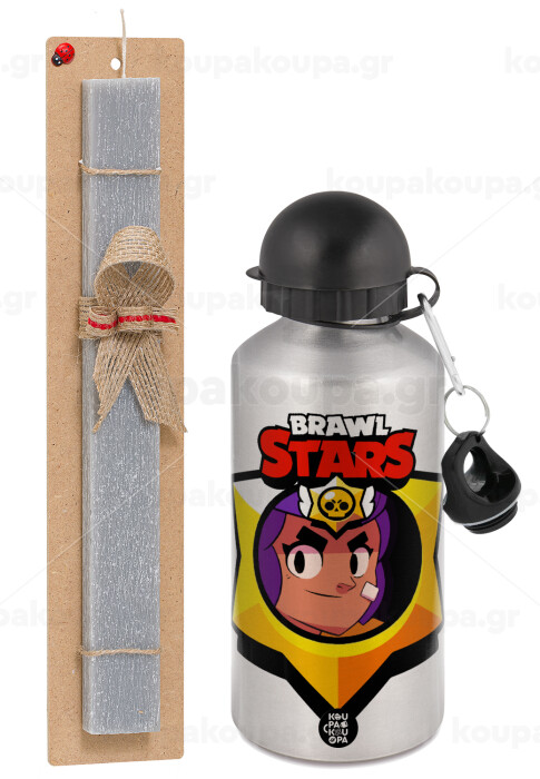 Brawl Stars Shelly, Easter Set, metallic silver aluminum water bottle (500ml) & aromatic flat Easter candle (30cm) (GRAY)