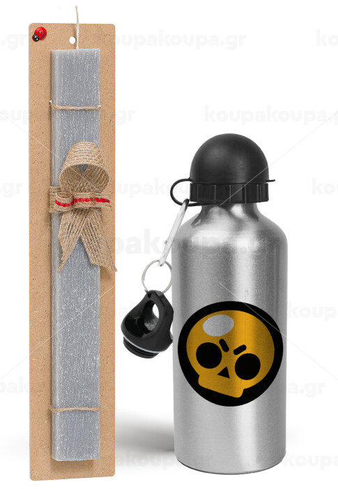 Brawl Stars Skull, Easter Set, metallic silver aluminum water bottle (500ml) & aromatic flat Easter candle (30cm) (GRAY)
