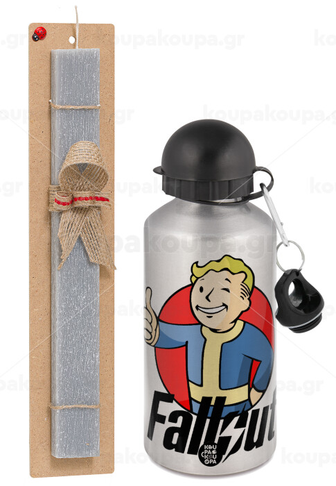 Fallout Vault Boy, Easter Set, metallic silver aluminum water bottle (500ml) & aromatic flat Easter candle (30cm) (GRAY)