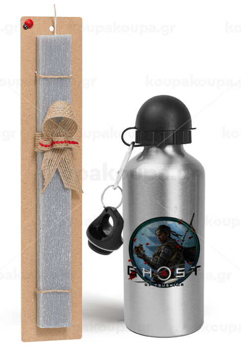 Ghost of Tsushima, Easter Set, metallic silver aluminum water bottle (500ml) & aromatic flat Easter candle (30cm) (GRAY)