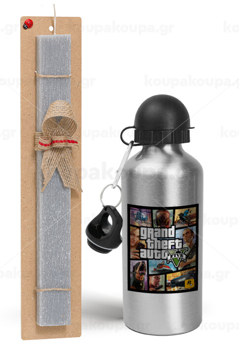 GTA V, Easter Set, metallic silver aluminum water bottle (500ml) & aromatic flat Easter candle (30cm) (GRAY)