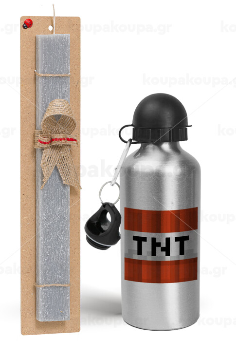 Minecraft TNT, Easter Set, metallic silver aluminum water bottle (500ml) & aromatic flat Easter candle (30cm) (GRAY)