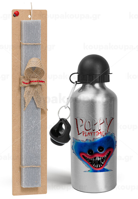Poppy Playtime Huggy wuggy, Easter Set, metallic silver aluminum water bottle (500ml) & aromatic flat Easter candle (30cm) (GRAY)