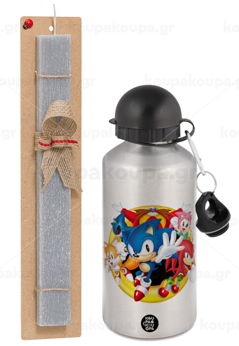 Sonic and friends, Easter Set, metallic silver aluminum water bottle (500ml) & aromatic flat Easter candle (30cm) (GRAY)