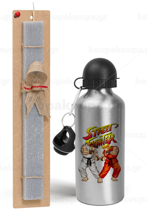 Street fighter, Easter Set, metallic silver aluminum water bottle (500ml) & aromatic flat Easter candle (30cm) (GRAY)