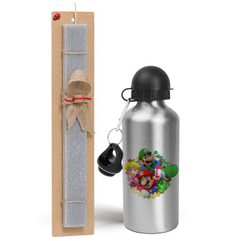 Super mario and Friends, Easter Set, metallic silver aluminum water bottle (500ml) & aromatic flat Easter candle (30cm) (GRAY)