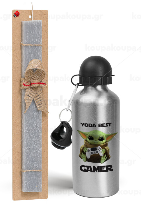 Yoda Best Gamer, Easter Set, metallic silver aluminum water bottle (500ml) & aromatic flat Easter candle (30cm) (GRAY)