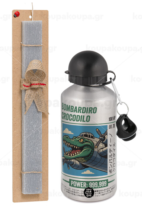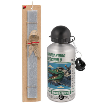 Bombardiro Crocodilo, Easter Set, metallic silver aluminum water bottle (500ml) & aromatic flat Easter candle (30cm) (GRAY)