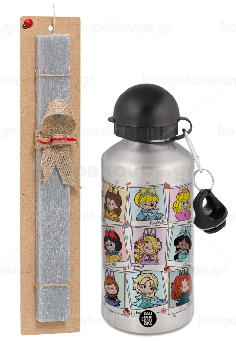 Labubu characters, Easter Set, metallic silver aluminum water bottle (500ml) & aromatic flat Easter candle (30cm) (GRAY)