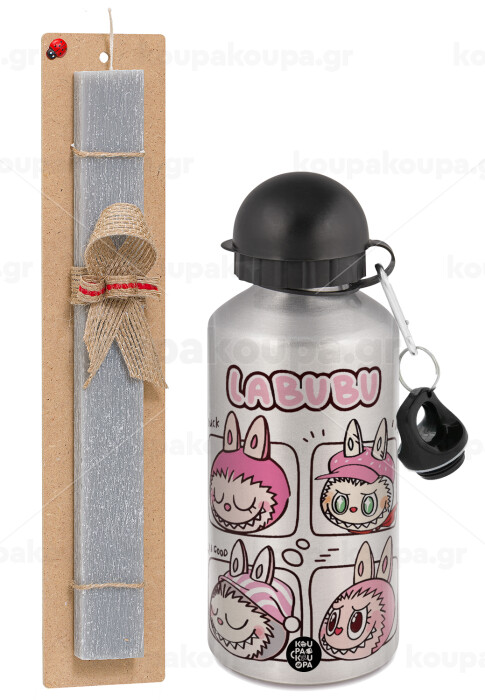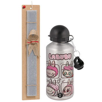 Labubu pink, Easter Set, metallic silver aluminum water bottle (500ml) & aromatic flat Easter candle (30cm) (GRAY)
