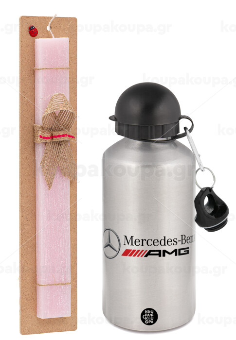 AMG Mercedes, Easter Set, metallic Silver aluminum water bottle (500ml) & scented flat Easter candle (30cm) (PINK)