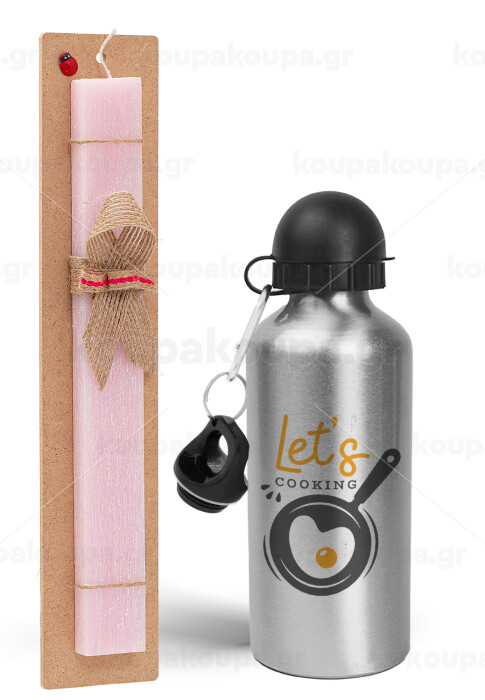 Let's cooking, Easter Set, metallic Silver aluminum water bottle (500ml) & scented flat Easter candle (30cm) (PINK)