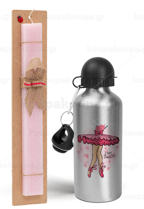 I Love Ballet, Easter Set, metallic Silver aluminum water bottle (500ml) & scented flat Easter candle (30cm) (PINK)
