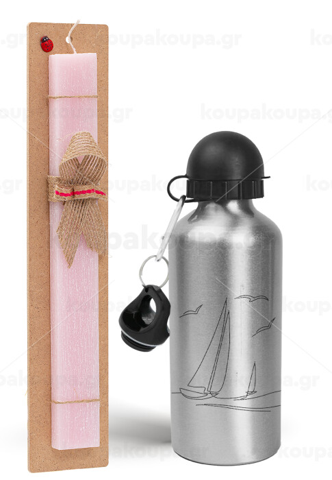 Sailing, Easter Set, metallic Silver aluminum water bottle (500ml) & scented flat Easter candle (30cm) (PINK)