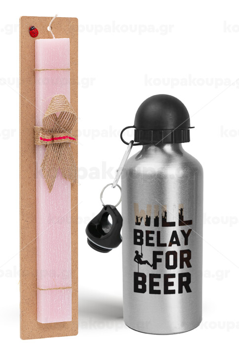 Will Belay For Beer, Easter Set, metallic Silver aluminum water bottle (500ml) & scented flat Easter candle (30cm) (PINK)