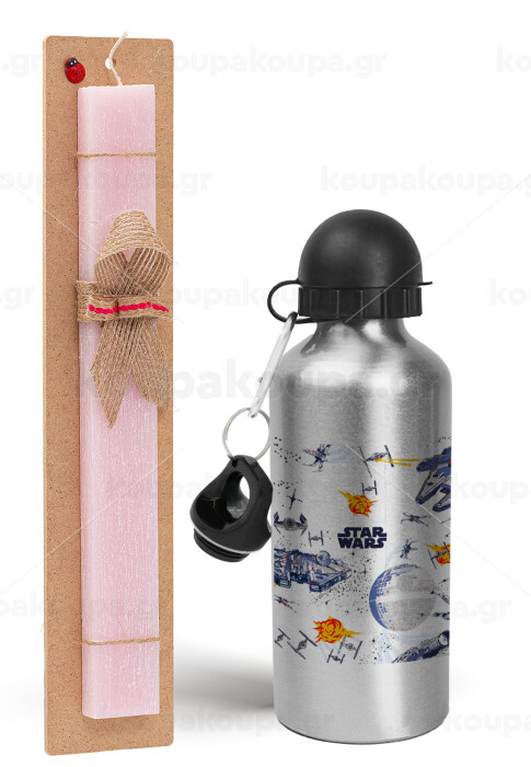 Star wars drawing, Easter Set, metallic Silver aluminum water bottle (500ml) & scented flat Easter candle (30cm) (PINK)