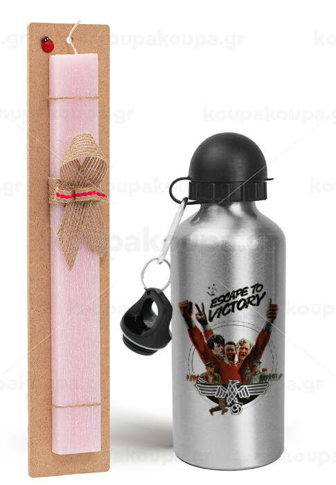 Escape to victory, Easter Set, metallic Silver aluminum water bottle (500ml) & scented flat Easter candle (30cm) (PINK)