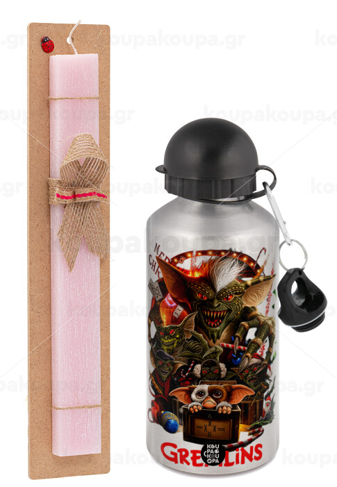 Gremlins, Easter Set, metallic Silver aluminum water bottle (500ml) & scented flat Easter candle (30cm) (PINK)