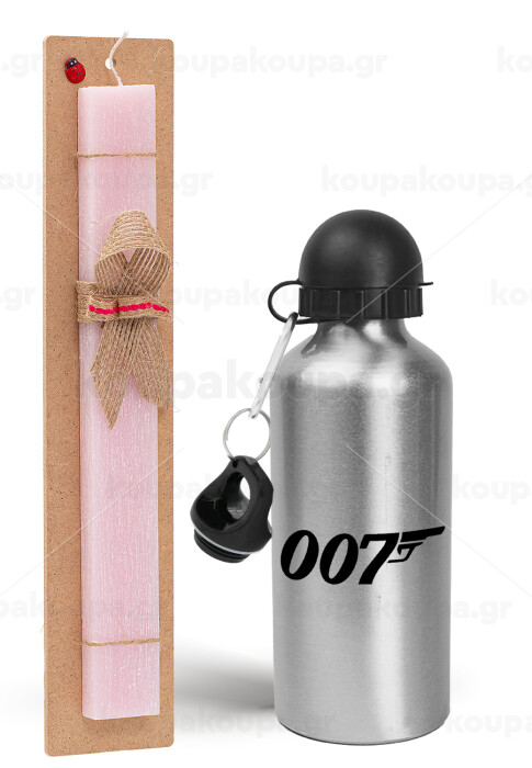 James Bond 007, Easter Set, metallic Silver aluminum water bottle (500ml) & scented flat Easter candle (30cm) (PINK)