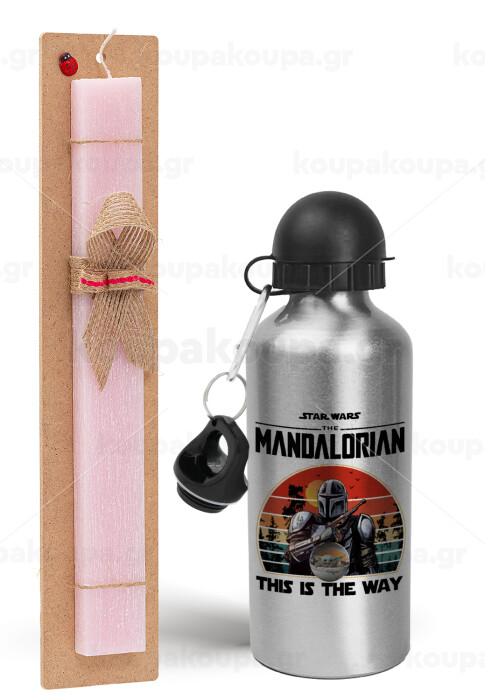 Mandalorian, Easter Set, metallic Silver aluminum water bottle (500ml) & scented flat Easter candle (30cm) (PINK)