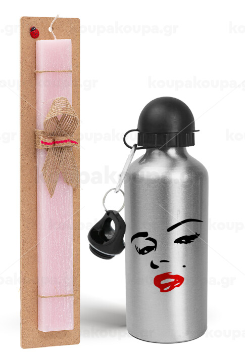Marilyn Monroe, Easter Set, metallic Silver aluminum water bottle (500ml) & scented flat Easter candle (30cm) (PINK)