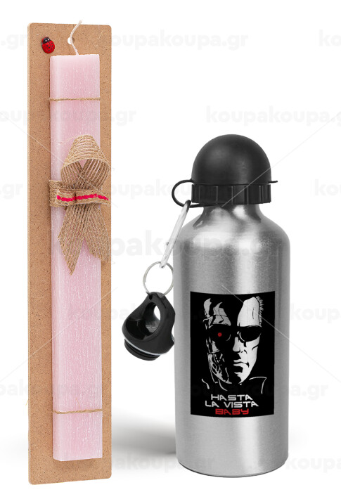 Terminator Hasta La Vista, Easter Set, metallic Silver aluminum water bottle (500ml) & scented flat Easter candle (30cm) (PINK)