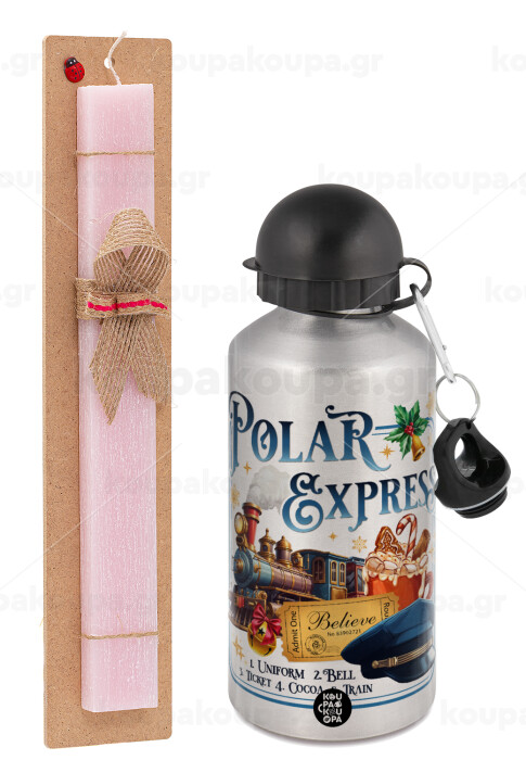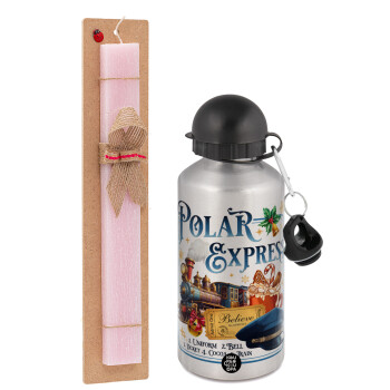 The Polar Express, Easter Set, metallic Silver aluminum water bottle (500ml) & scented flat Easter candle (30cm) (PINK)