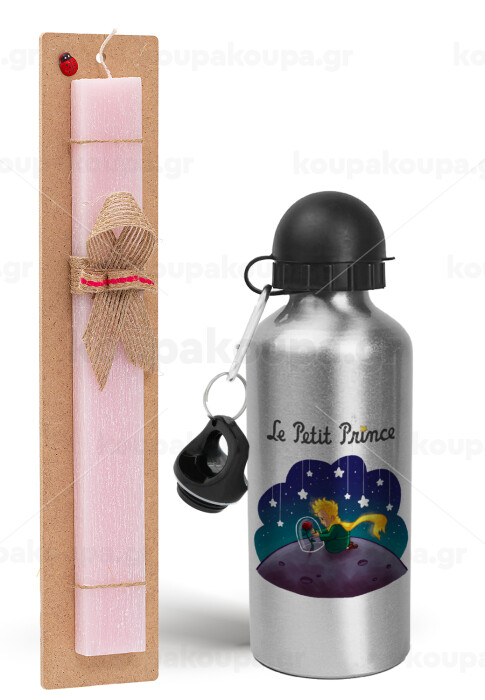 Little prince, Easter Set, metallic Silver aluminum water bottle (500ml) & scented flat Easter candle (30cm) (PINK)