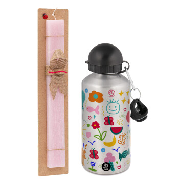 Παιδική φαντασία, Easter Set, metallic Silver aluminum water bottle (500ml) & scented flat Easter candle (30cm) (PINK)