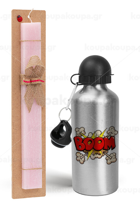 BOOM!!!, Easter Set, metallic Silver aluminum water bottle (500ml) & scented flat Easter candle (30cm) (PINK)