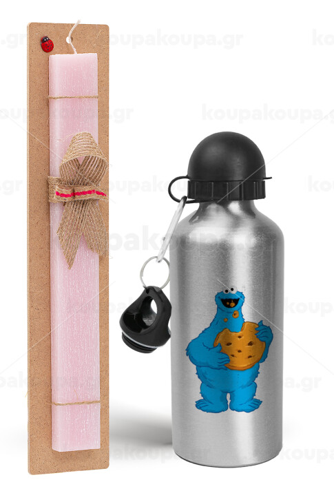Cookie Monster, Easter Set, metallic Silver aluminum water bottle (500ml) & scented flat Easter candle (30cm) (PINK)