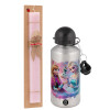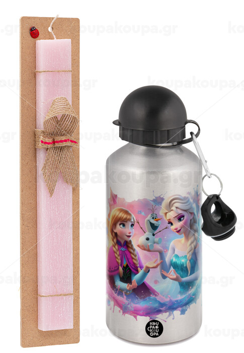 Elsa & Anna Princess, Easter Set, metallic Silver aluminum water bottle (500ml) & scented flat Easter candle (30cm) (PINK)