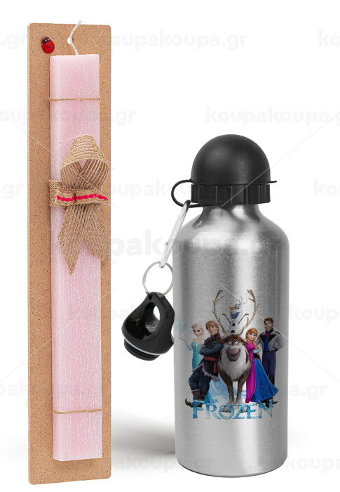Frozen, Easter Set, metallic Silver aluminum water bottle (500ml) & scented flat Easter candle (30cm) (PINK)